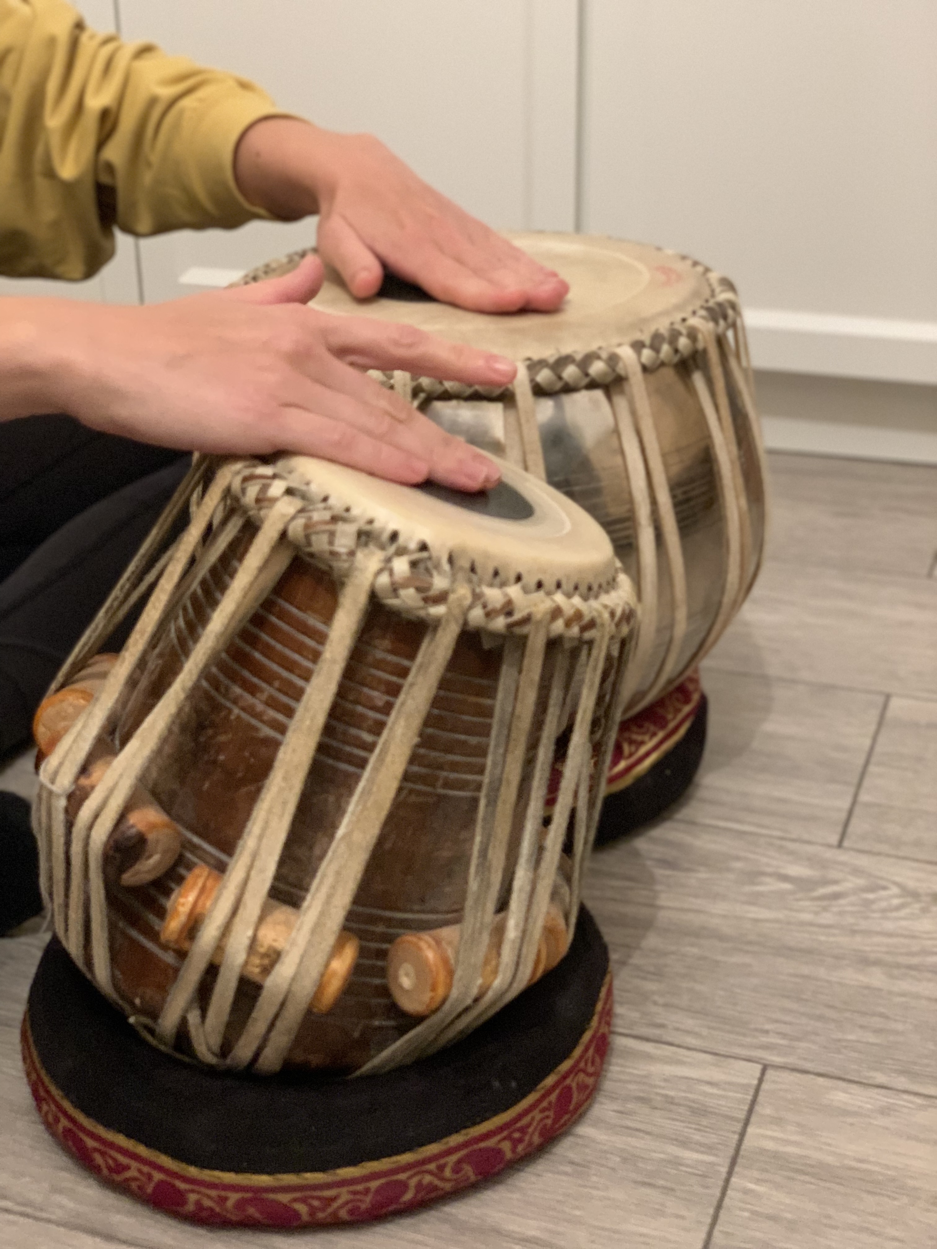(pictured left) Tabla is played sitting on the floor with the drums resting on ‘beeras’ (rings).